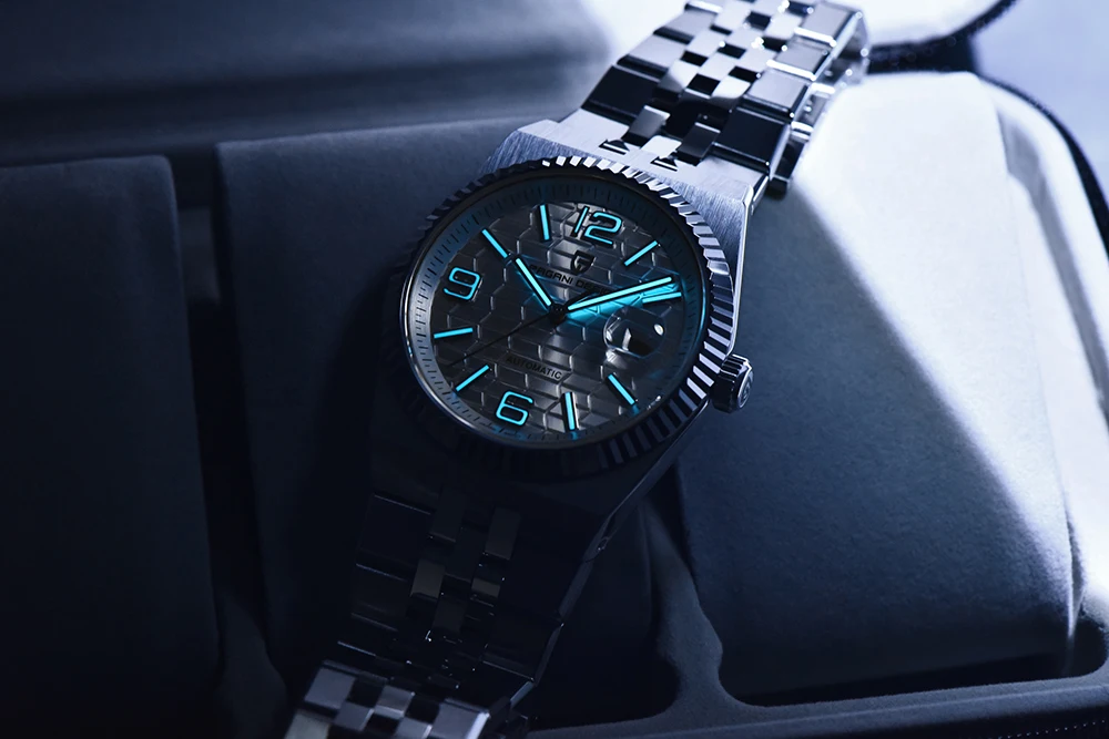 O relógio Pagani Design Land-Dweller utiliza cristal de safira, um dos materiais mais prestigiados no mundo da alta relojoaria, conhecido por sua transparência e durabilidade excepcionais.
