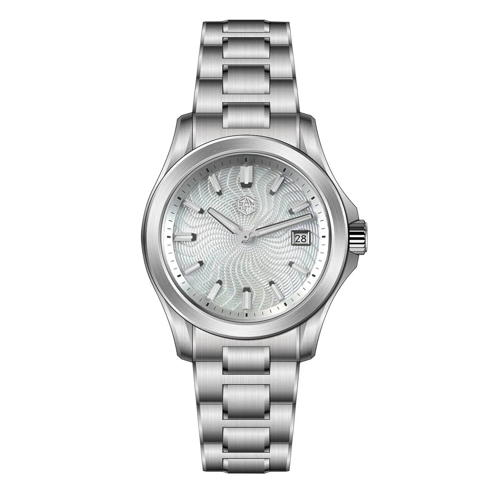 A pulseira é cuidadosamente projetada com materiais premium, combinando a resistência e leveza do aço inoxidável 316L. Proporciona um conforto incomparável e uma sensação única de estar usando um relógio quase imperceptível no pulso.