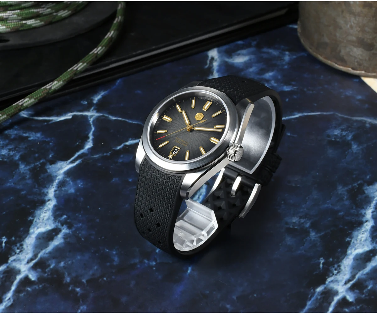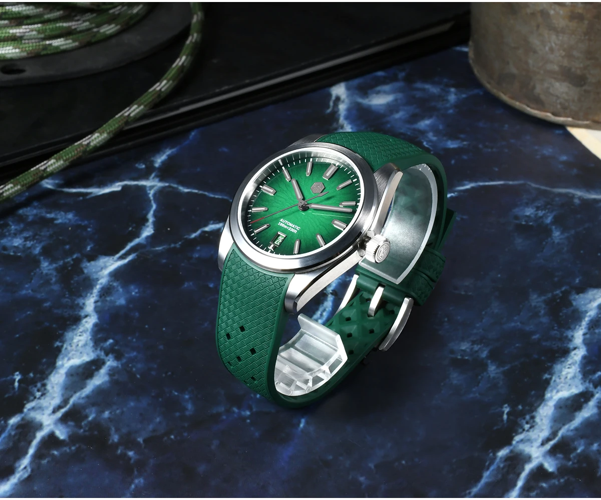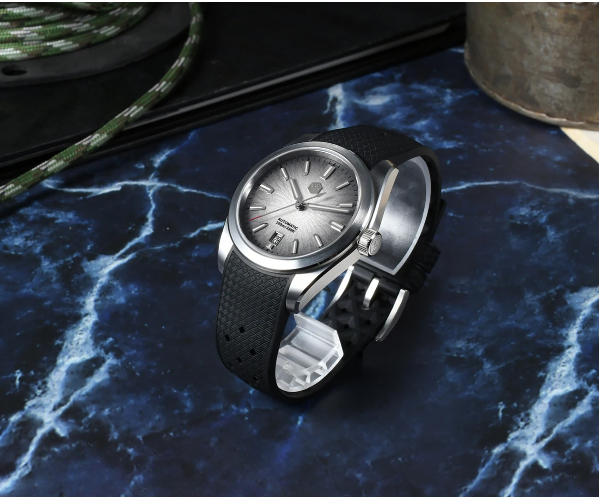 A pulseira é cuidadosamente projetada com materiais premium, combinando a resistência e leveza da borracha. Proporciona um conforto incomparável e uma sensação única de estar usando um relógio quase imperceptível no pulso.