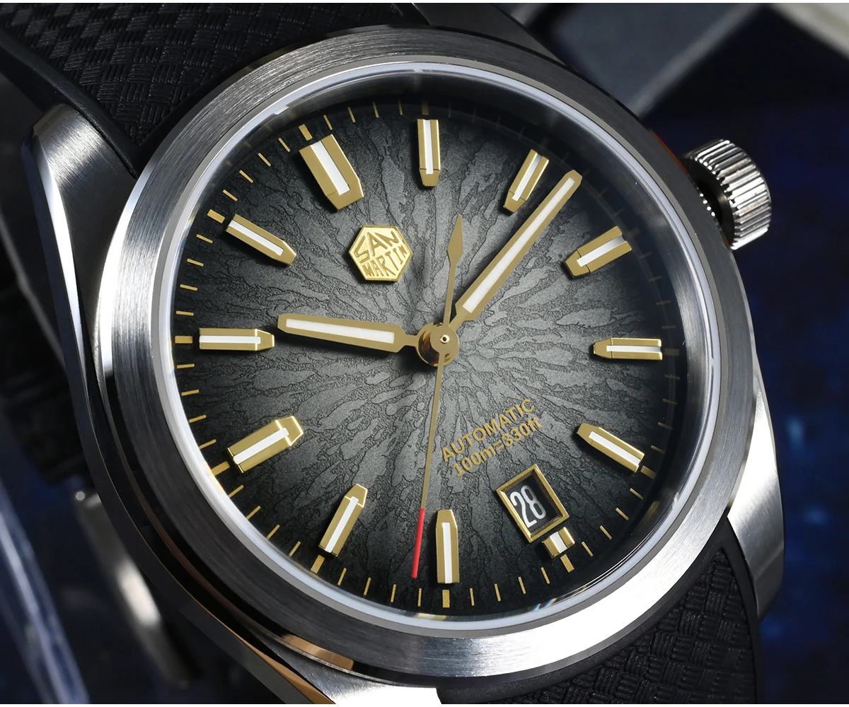 O relógio é fabricado com aço inoxidável 316L, um material antialérgico e altamente resistente à corrosão, oferecendo resistência, brilho e durabilidade excepcionais.